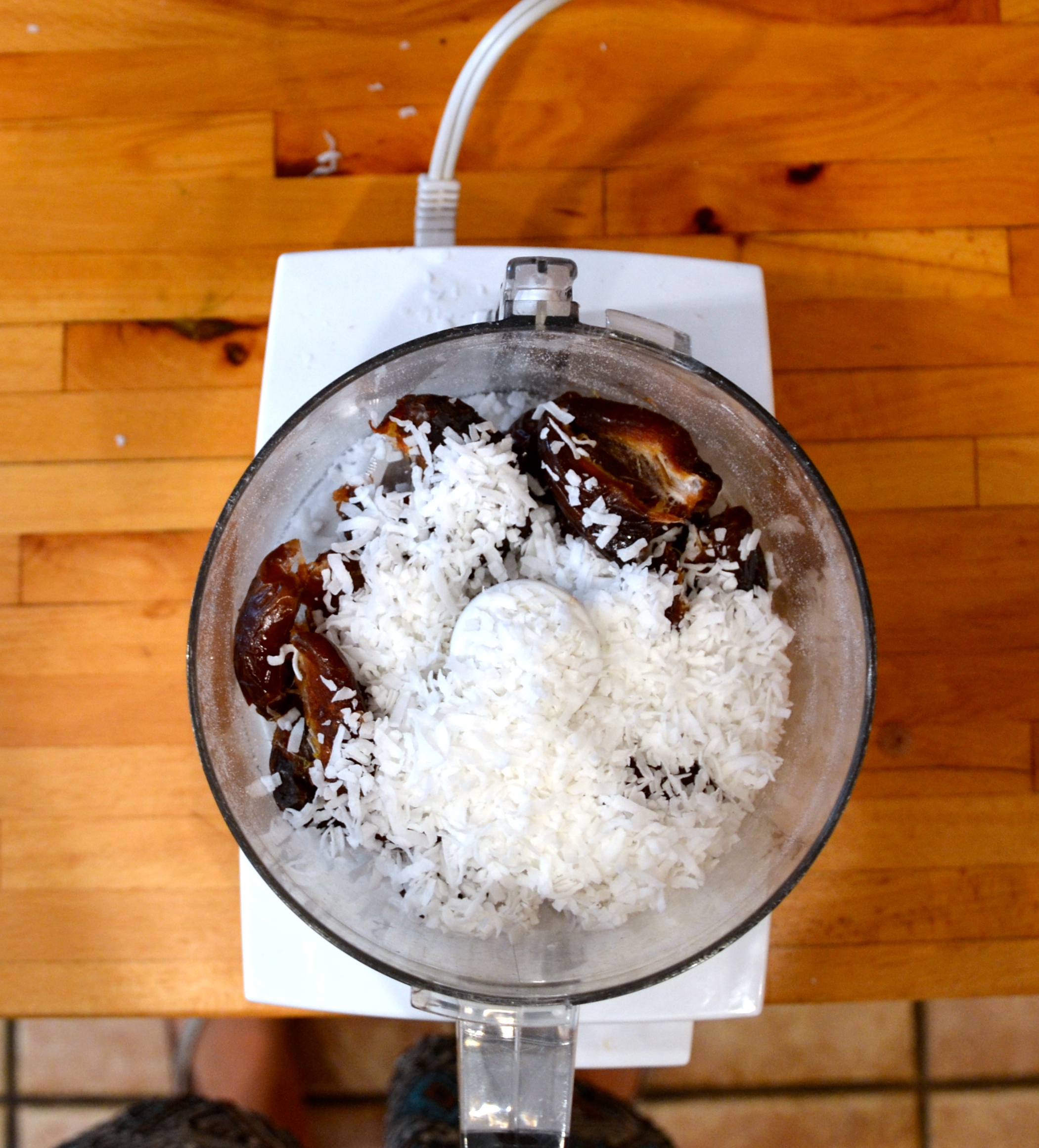 Put dates and coconut into a food processor and blend for 1-3 minutes, till the coconut and dates are almost a paste. On a sheet of wax paper, make balls out of the mixture (about 6) and place in the fridge.